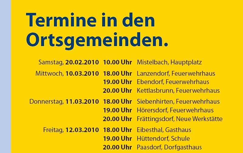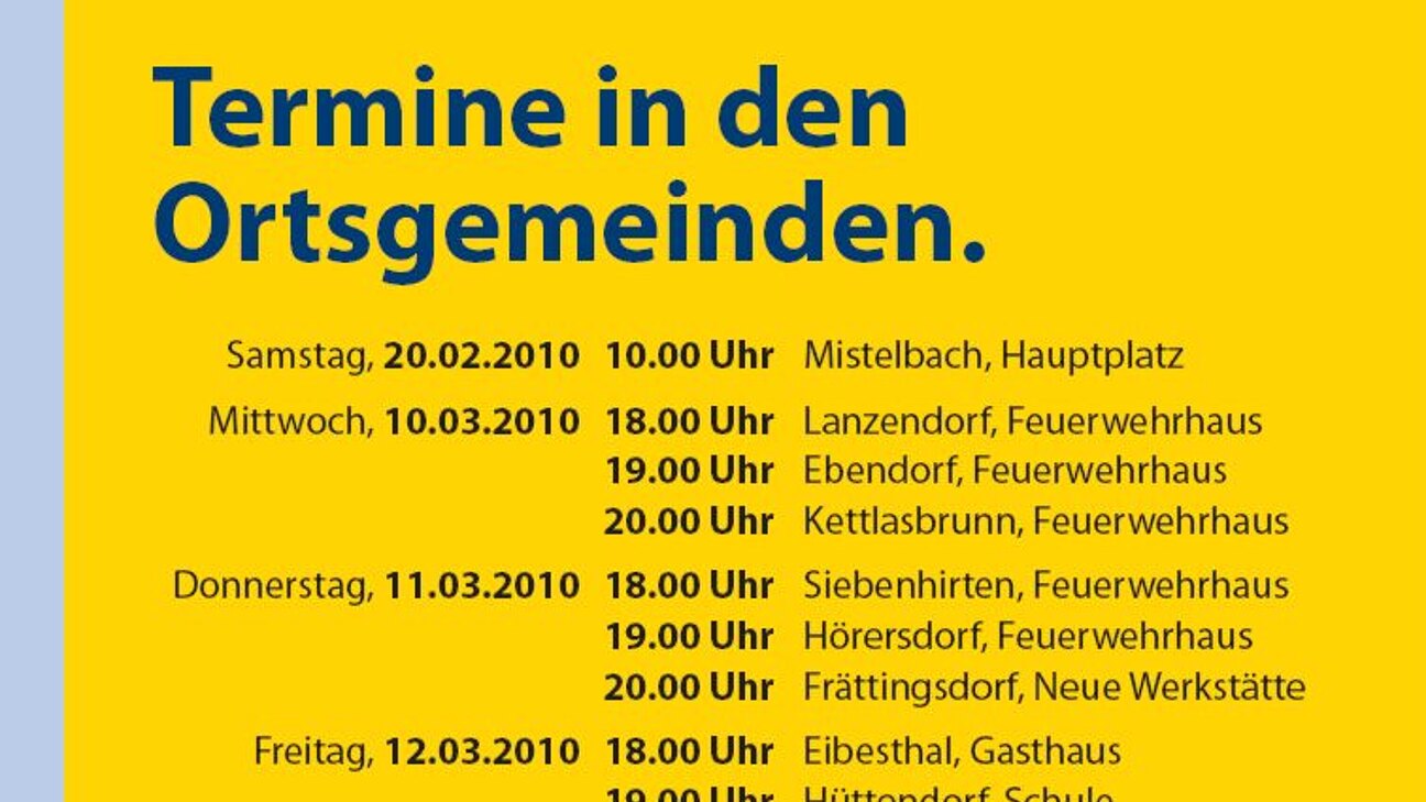 Nur noch eine Woche bis zur Gemeinderatswahl. Ab Mittwoch besucht Dr. Alfred Pohl und das gesamt Gemeinderatsteam der ÖVP alle Ortsgemeinden. Der Treffpunkt ist vor den jeweils angegebenen Ortsmittelpunkten (Gast- bzw. Feuerwehrhäusern). "Wir laden Sie herzlich ein, bei dieser kurzen Abschlusskundgebung unser Gast zu sein".