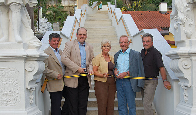 45 Stiegen führen von den beiden frisch restaurierten Sandsteinfiguren des Hl. Florians und des Hl.…